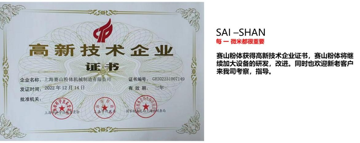 賽山粉體獲得高新技術(shù)企業(yè)證書,賽山粉體將繼續(xù)加大設(shè)備的研發(fā),改進(jìn)。同時也歡迎新老客戶來我司考察,指導(dǎo)。